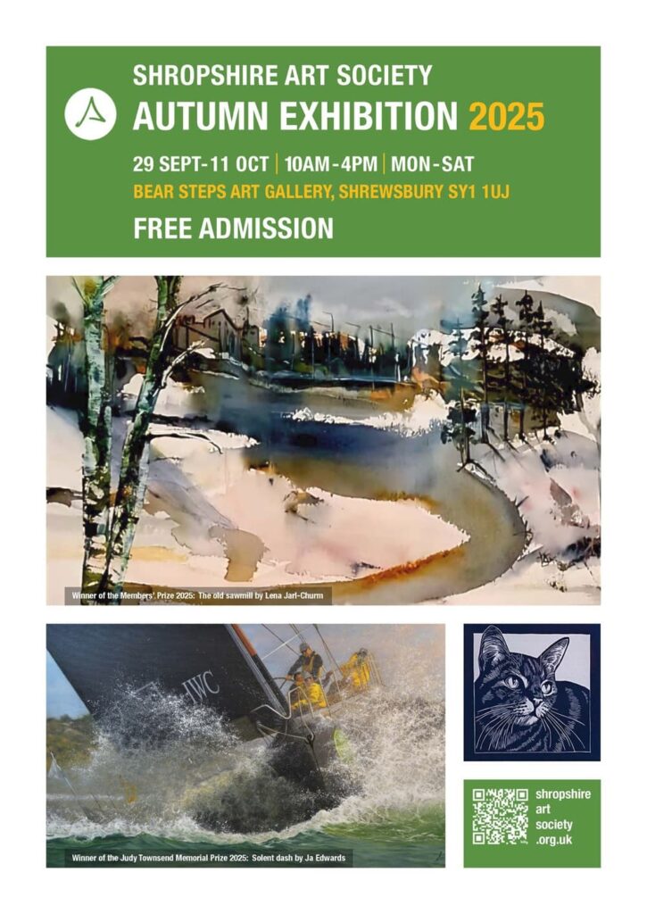 On NOW! Visit our Autumn Exhibition which is open at the Bear Steps Gallery, Shrewsbury, from Monday 29th September Saturday 11th October (10am to 4pm, closes 1pm on the final day). Framed and unframed works as well as greetings cards, all by Shropshire artists, are available for purchase. We look forward to welcoming you to the exhibition!